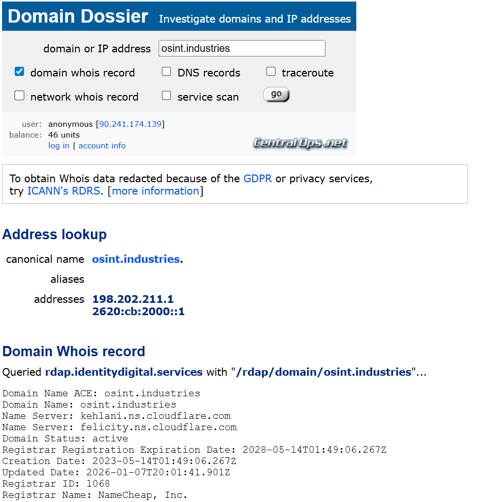 Domain Dossier is a simple and effective OSINT tool for investigating the technical infrastructure behind websites and domains. Whilst it cannot always reveal the real owner of a domain, it's a valuable starting point for online investigations.
