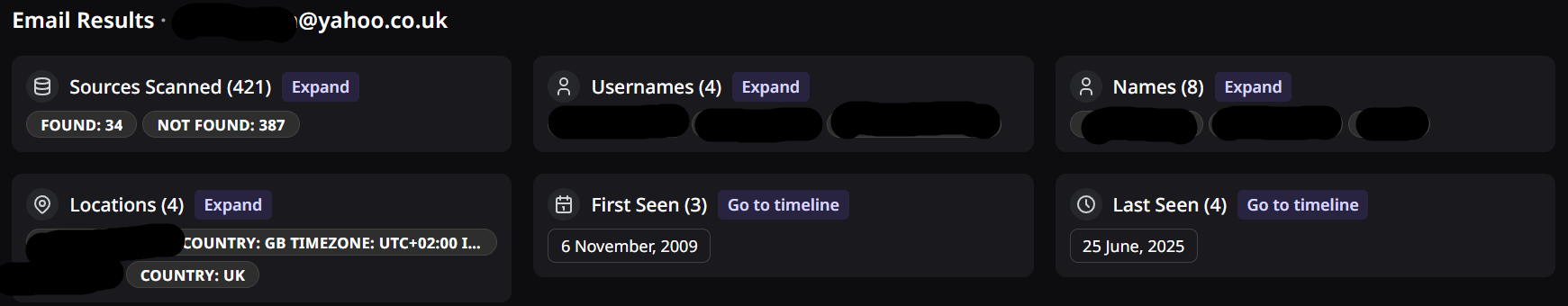 **2. Review generated intelligence, linked accounts, breaches, locations, activity timelines, etc.**